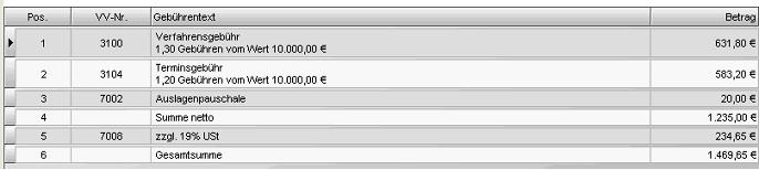 3.) Anwaltskosten: Im gerichtlichen Verfahren kann der Anwalt eine 1,3 er Verfahrensgebühr und eine 1,2 er Terminsgebühr geltend machen, wenn ein mündlicher Termin bei Gericht wahrgenommen wurde.