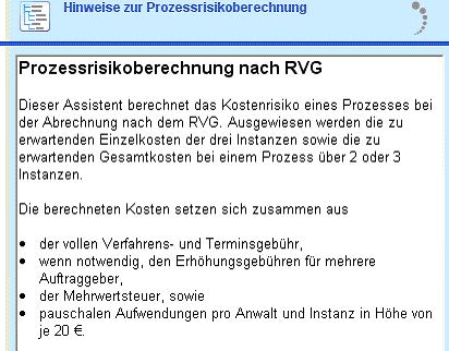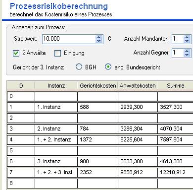 Hierzu haben die Anwälte zumeist ein Programm zur Prozessrisikoberechnung, welches wie folgt z.B. aussieht (Stand 15.03.2012):